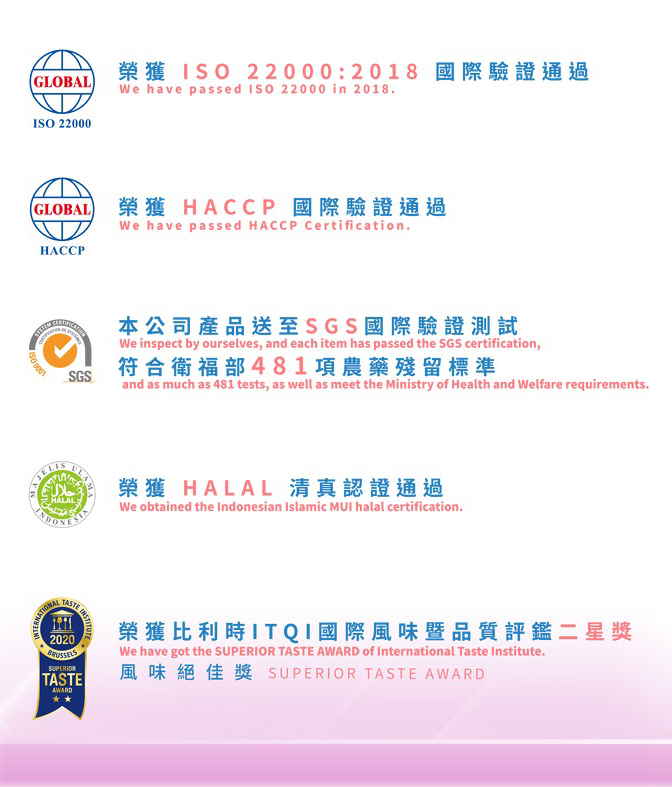 茶葉均通過ISO 22000、HACCP、SGS國際認證、HALAL清真認證、 符合衛福部481項農藥殘留標準。